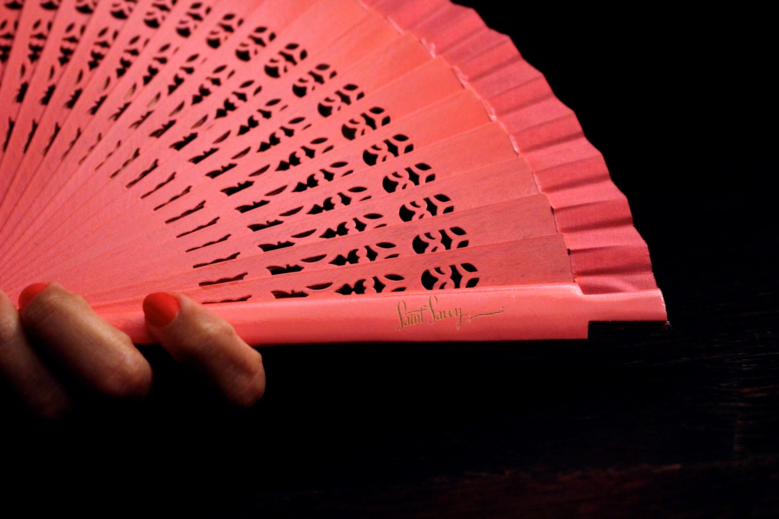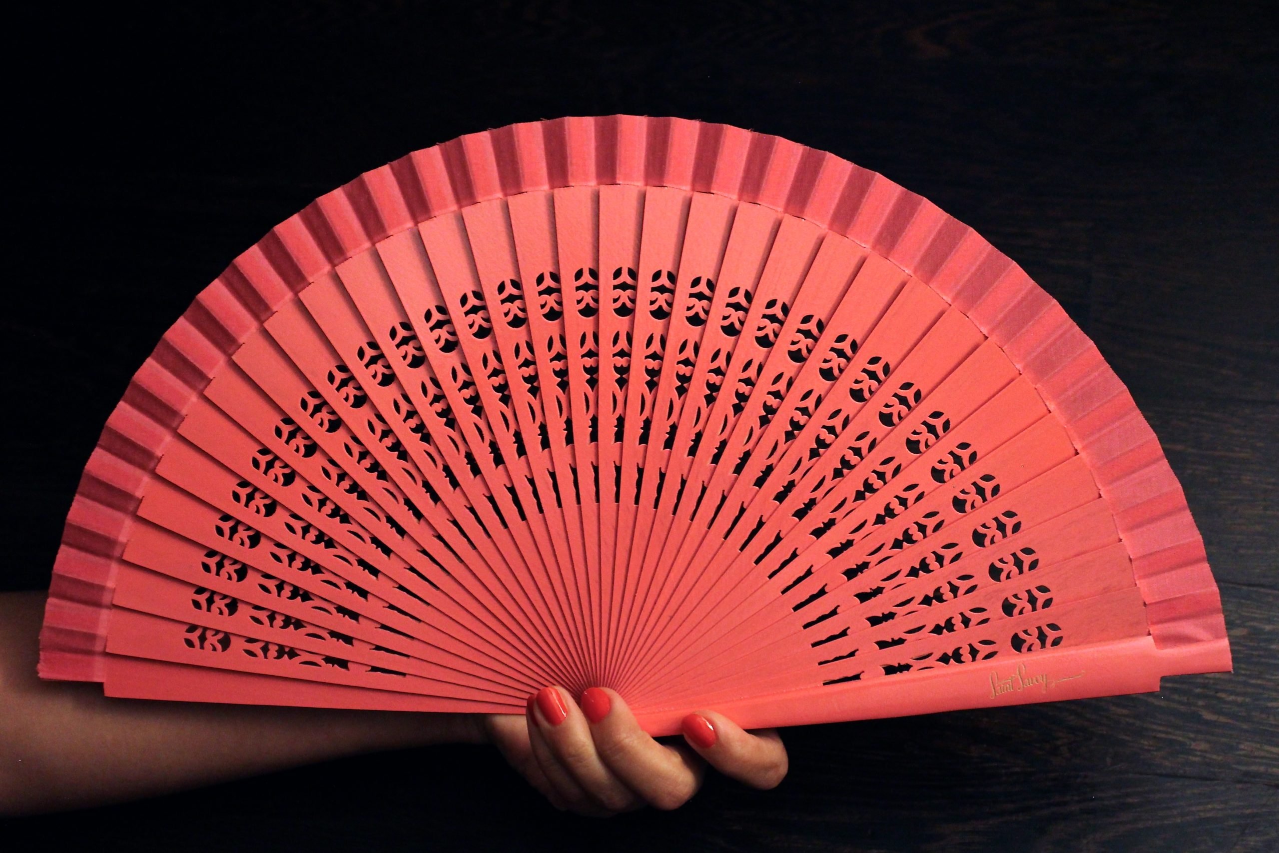 A good fan is one of the dancer’s most important accessories. Our fans are made of paper-thin carved wood and finished with cotton trim. We have carved the “COCO” pattern into the slats and delicately engraved our logo on the top cover.