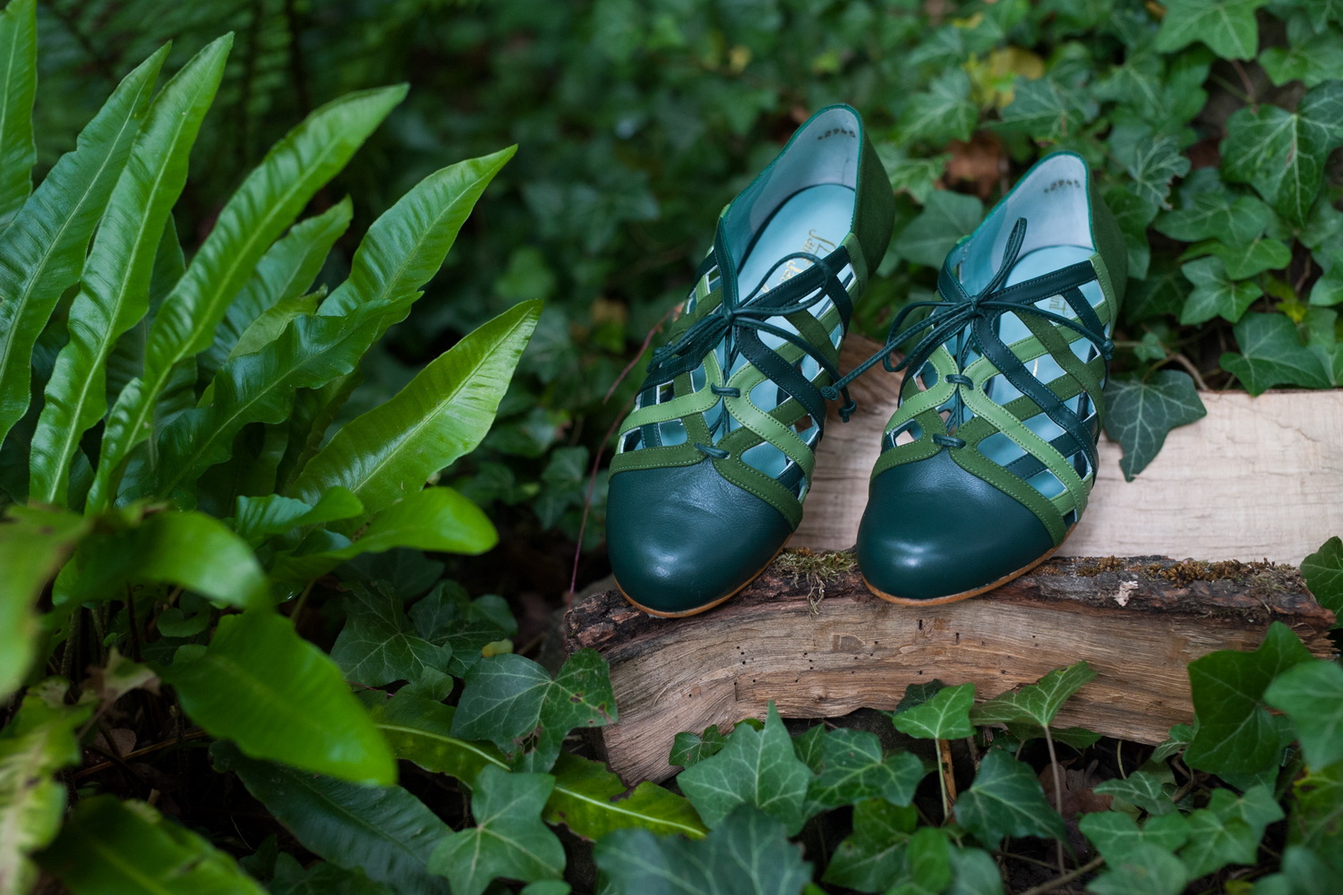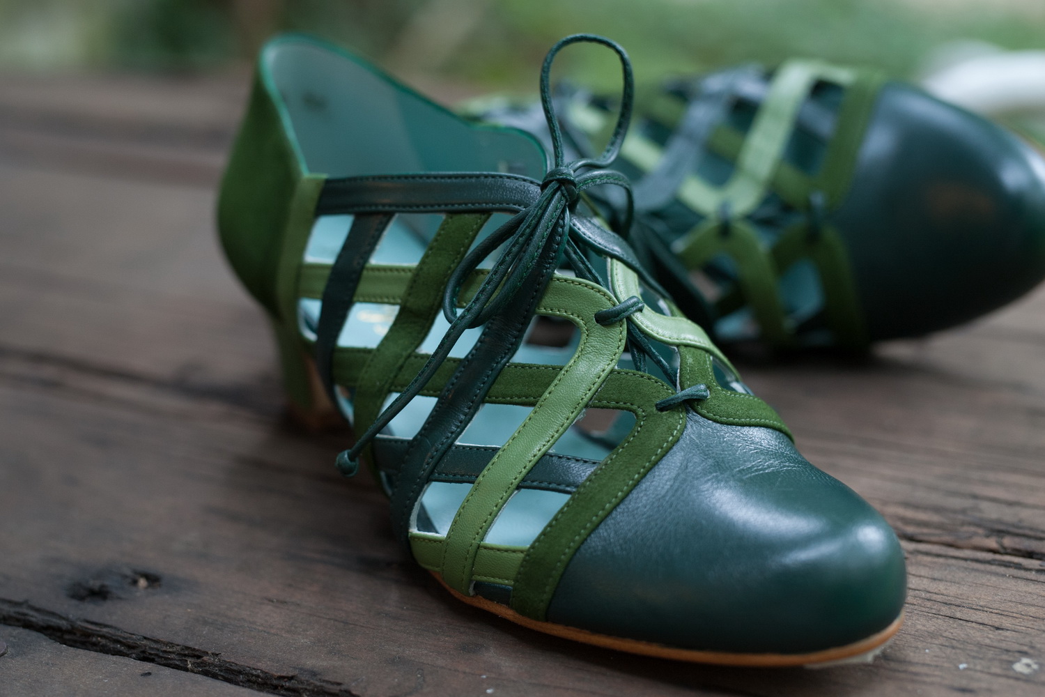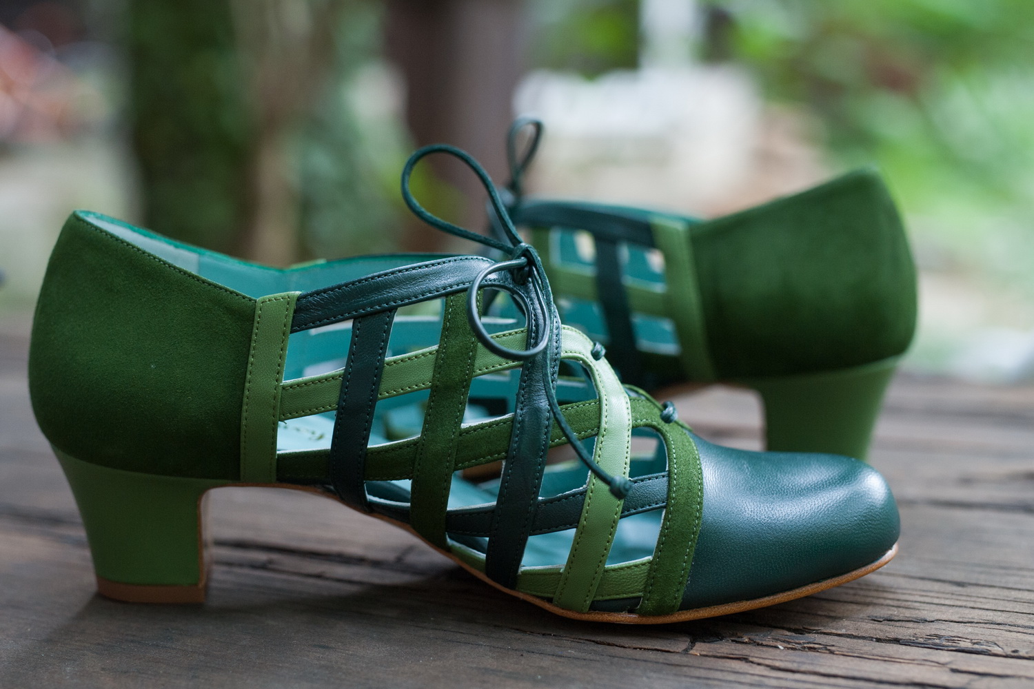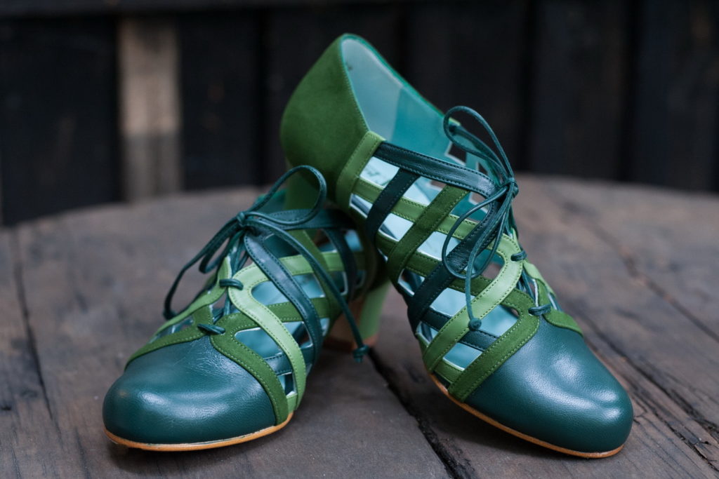 You will love these flamboyant lace-up heels in shades of green inspired by a model of 1930s shoes! Their shape provides solid support, while intricate woven leather bands create a delicate look and excellent ventilation for your busy feet. These vintage shoes are not only extravagant, but oh so comfortable to dance the night away!