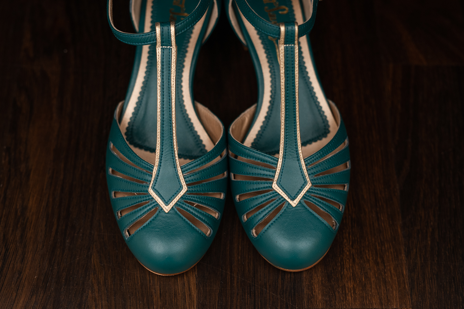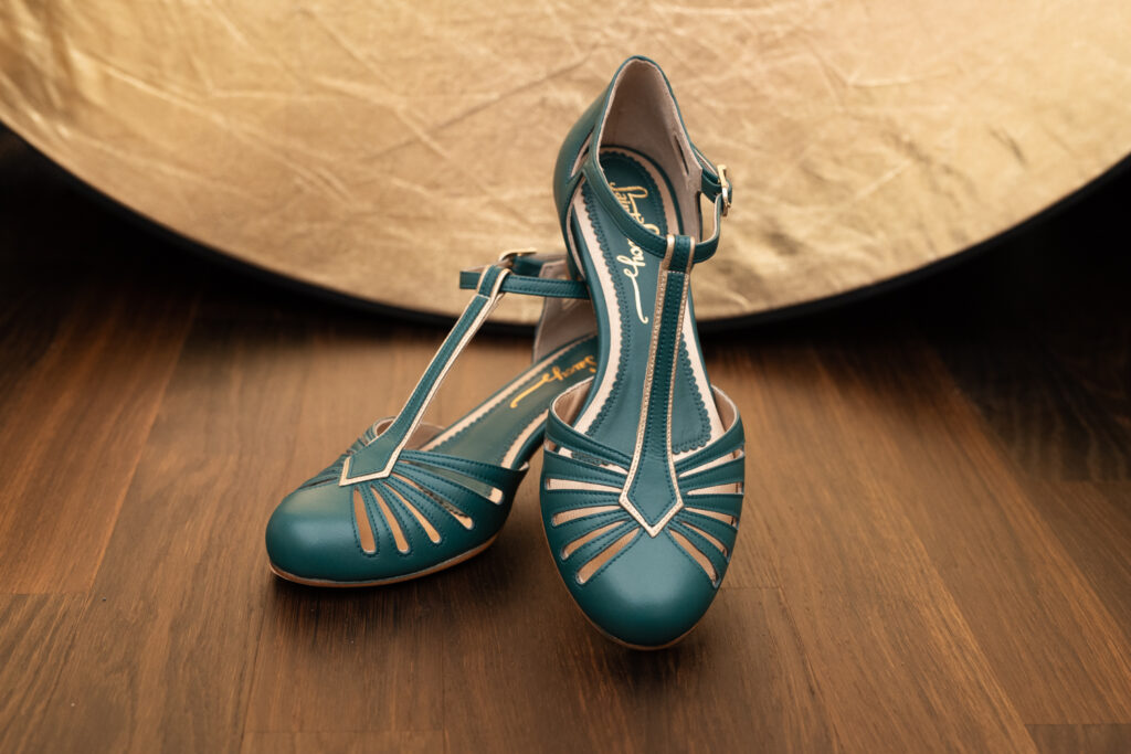 These rich, dark green and gold retro shoes bring an air of Art Deco with them! Great for walking or dancing, the soft padding and heel height are perfect for all occasions.