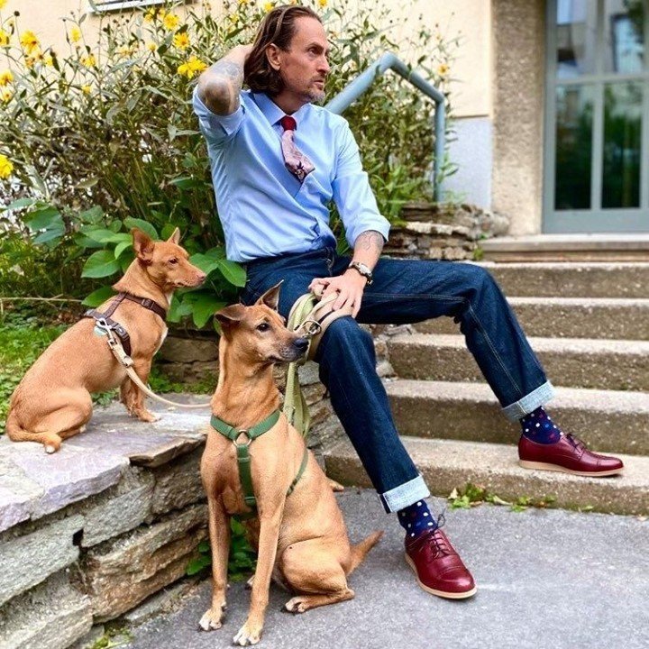 Dancing Shoes, GentlemenRUGCUTTER Burgundy Posted on 30. October 202030. October 2020 by Savoy Social 30 Oct The style, the dogs, that look, the shoes! This is handsome Markus Ster wearing RUGCUTTER Burgundy. @Mas260571⠀ Savoy Social Wedding: WEST Champagne RIVIERA High in Black Pearl
