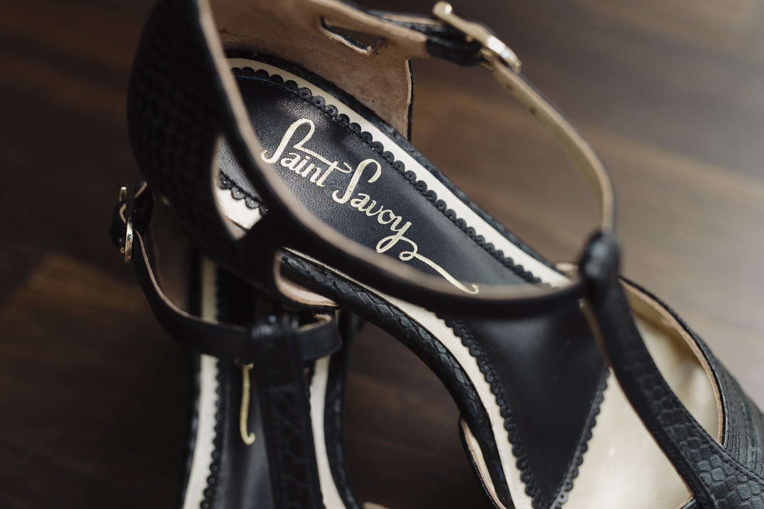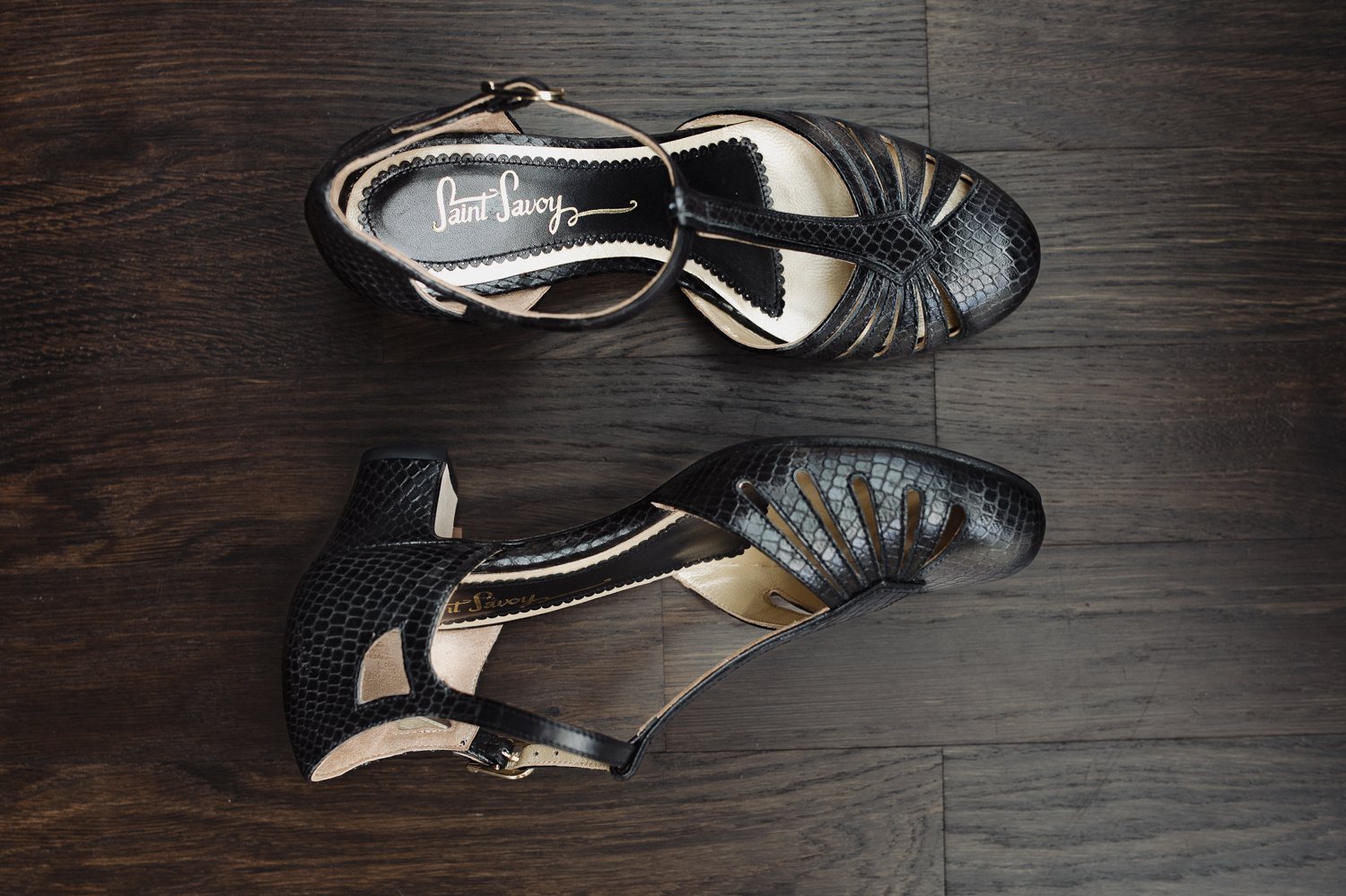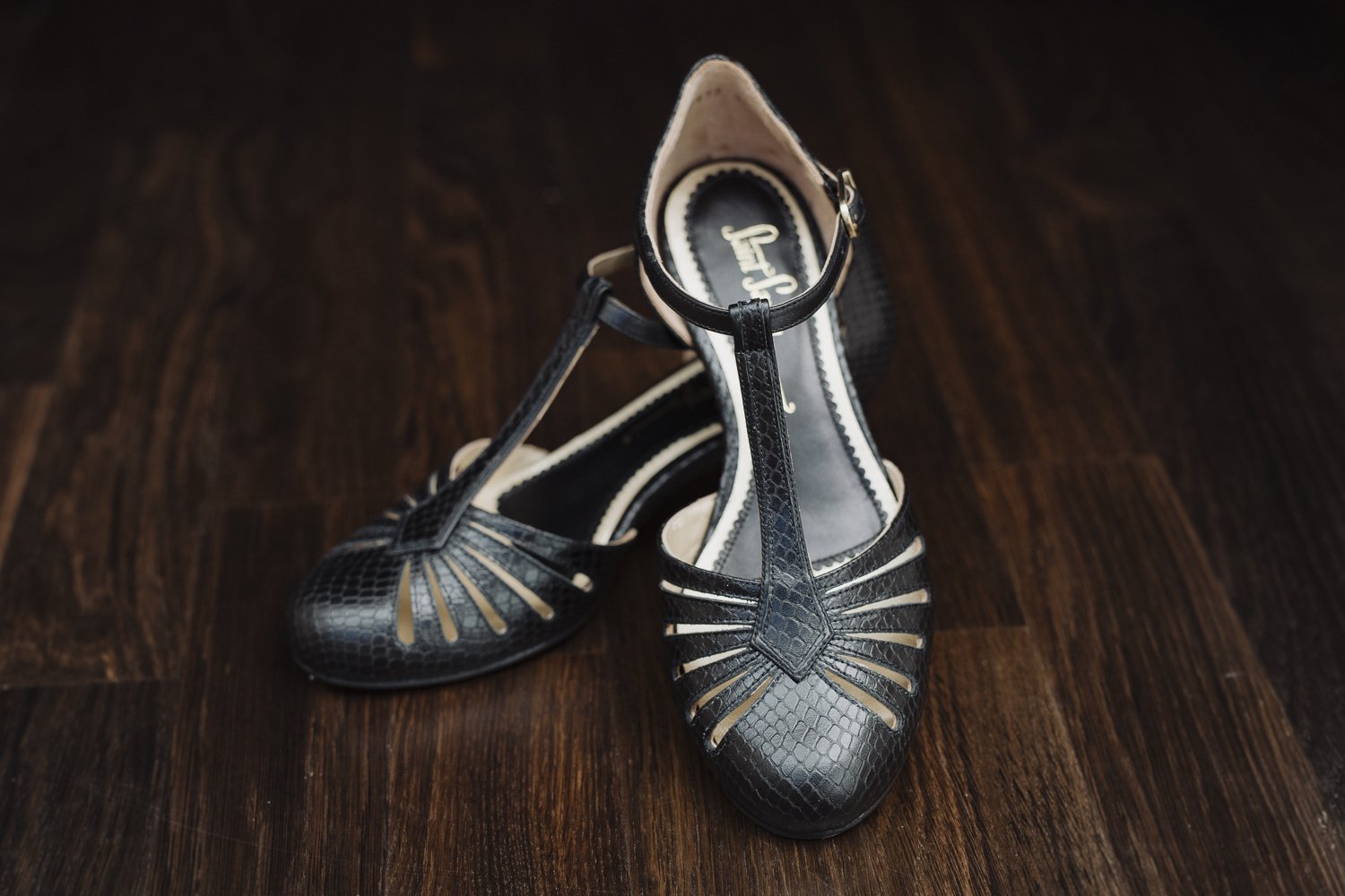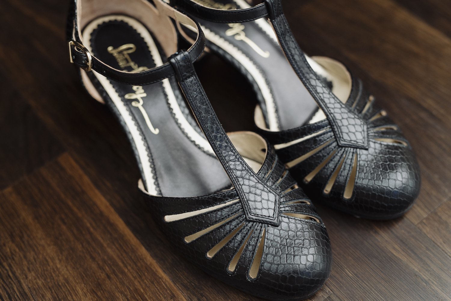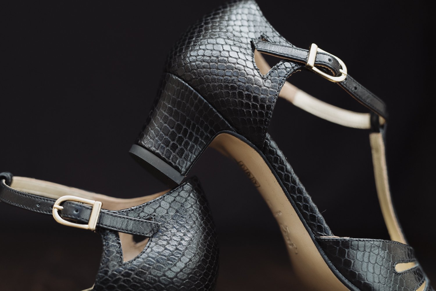 Mit diesen Eigenschaften verdienen sie das Prädikat beste Tanzschuhe! Das mit Schlangenmuster geprägte schwarze Kalbsleder und das goldene Futter machen diese Paar schwarze T-Strap Schuhe zu einem besonderen Hingucker im Vintage Stil.