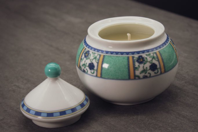 Wenn die Kerze nach vielen behaglichen Stunden des Dufterlebnisses abgebrannt ist, erfüllt die wunderschöne Porzellandose wieder ihren Zweck als dekoratives Aufbewahrungsobjekt und ist somit ein zero waste Produkt.